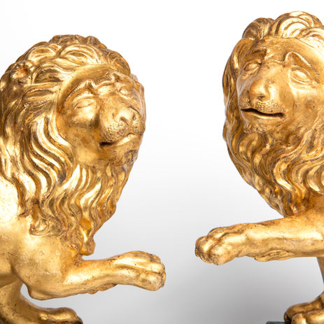 Maestosa coppia di leoni affrontati, scolpiti in legno e riccamente dorati, raffigurati in posizione araldica con una zampa anteriore sollevata. Le criniere fluenti e la modellazione vigorosa esaltano il carattere simbolico dell’animale, emblema di forza e protezione. Le basi, dipinte a finto marmo verde, completano la composizione conferendole equilibrio e solidità visiva.