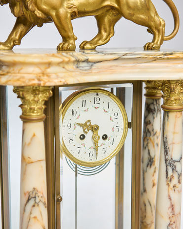 Elegante orologio da camino in bronzo dorato, finemente cesellato e sormontato da una figura leonina che conferisce forza e monumentalità all’insieme. Il quadrante smaltato, decorato da numeri romani, è racchiuso in una struttura riccamente ornata con motivi classici, foglie d'acanto e colonnine scanalate, tipici del gusto neoclassico francese ancora in voga nella seconda metà dell’Ottocento.