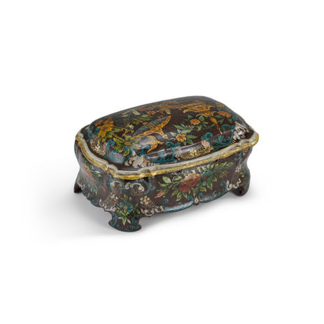 Elegante scatola in legno laccato veneziano del XVIII secolo, poggiante su piedini sagomati. Decorata con raffinati motivi floreali policromi su sfondo scuro, arricchiti da volute e dettagli dorati. Il coperchio bombato presenta una scena paesagisstica con architetture e figure orientali, di gusto tipico settecentesco.