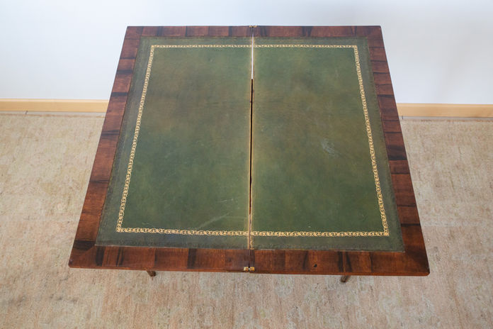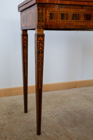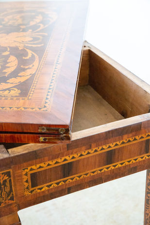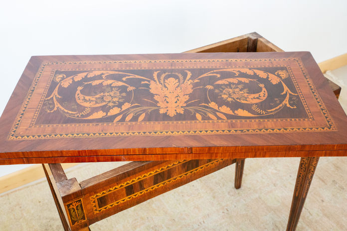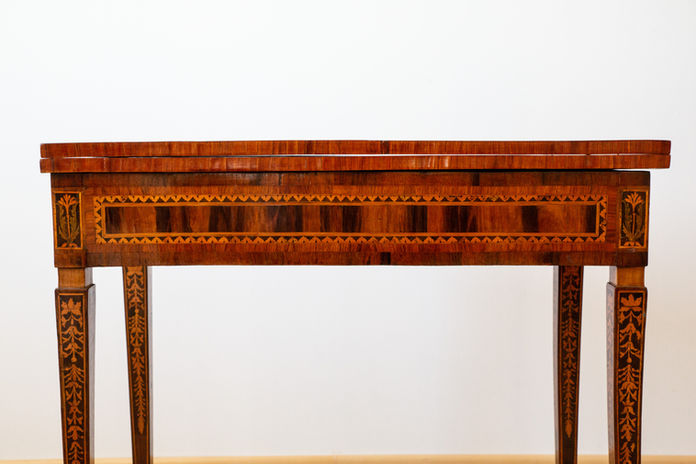 Straordinario tavolino da gioco in legno finemente intarsiato sul piano, sul fronte, sul retro e lungo tutte e quattro le gambe troncopiramidali.